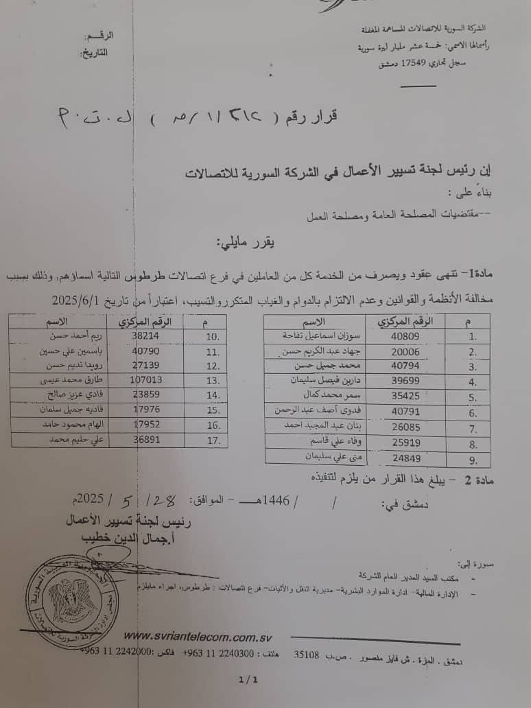 قرار جديد بفصل 17 عامل في شركة الاتصالات في طرطوس، ويظهر من أسماء عوائل المفصولين أنها عوائل من الطائفة العلوية