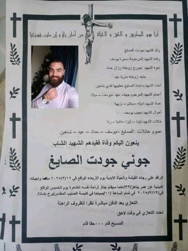 Johnny Judat Al-Sayegh, a #Christian young man, was killed today after being sniped in the city of #Baniyas while riding his motorcycle with his fiancée. It is believed that he was targeted because his fiancée was not wearing a hijab, which has become a sufficient reason for killing in Syria.