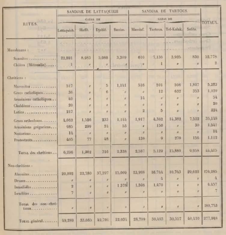 والصادر عن وزارة الخارجية الفرنسية والمطبوع في باريس سنة 1927، تَرِد في الإحصائية جداول بعنوان Population par rites، تُقدّم حصرًا للسكان وفق الانتماء الطائفي على مستوى الأقضية التابعة لدولة العلويين. وتُعدّ هذه الجداول من أندر وأدق الإحصاءات الرسمية المنشورة عن البنية الديموغرافية للساحل.