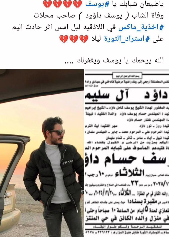 مقطع فيديو متداول يظهر لحظة استهداف الشهيد “يوسف حسام داؤود” صاحب محلات “ماكس” للأحذية في مدينة اللاذقية، وذلك بعد ملاحقته من قبل عدة أشخاص وإطلاق النار عليه. وهذا يناقض الادعاءات السابقة التي زعمت وفاته في حادث سير.