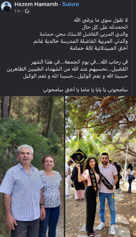 الشاب “حازم حمامة” ينعي والده ووالدته وشقيقته، الذين قتلوا على يد عناصر عصابات الجولاني الإرهابية وهم: