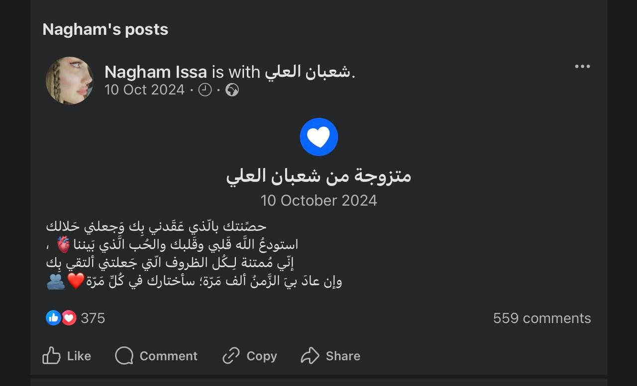 تنحدر السيدة نغم عيسى من قرية #خربة_الحمام، وهي زوجة علي شعبان الذي ينحدر من قرية #بلقسة، وهو شقيق المدعو شجاع علي، الذي اشتبك مع عناصر الميليشيا في قريته، مما أدى إلى مقتله.