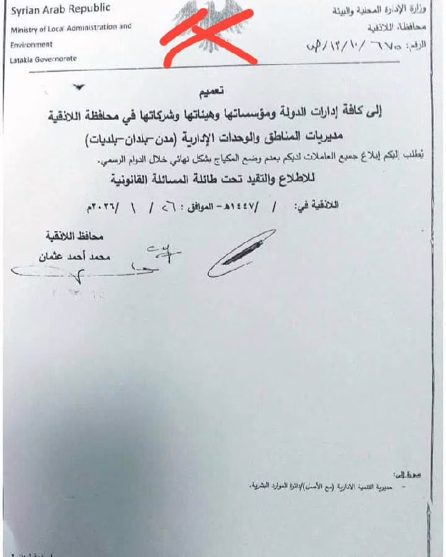 #اللاذقية: قرار جديد منسوب لمحافظ اللاذقية المعين من حكومة فلول القاعدة وداعش، بمنع “التبرج” للنساء بشكل نهائي، في جميع المديريات والشركات والمؤسسات الحكومية في جميع مناطق محافظة اللاذقية.