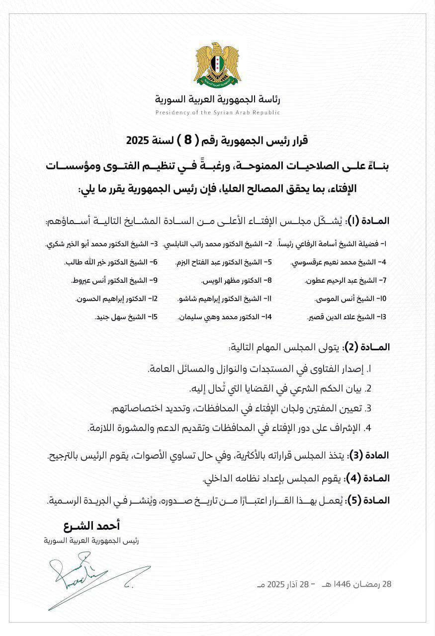 Al-Jolani Appoints Former HTS General Sharia Official to Syria’s Supreme Fatwa Council