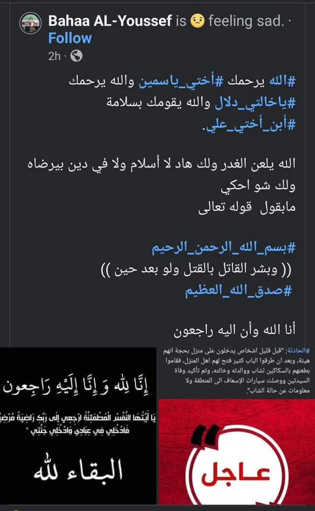 An armed group from the #HTS stormed the house of the Al-Youssef family in the “Jab Al-Jandali” area and killed the singer’s sister, “Yasmine Al-Youssef”, and his aunt, “Dalal” .