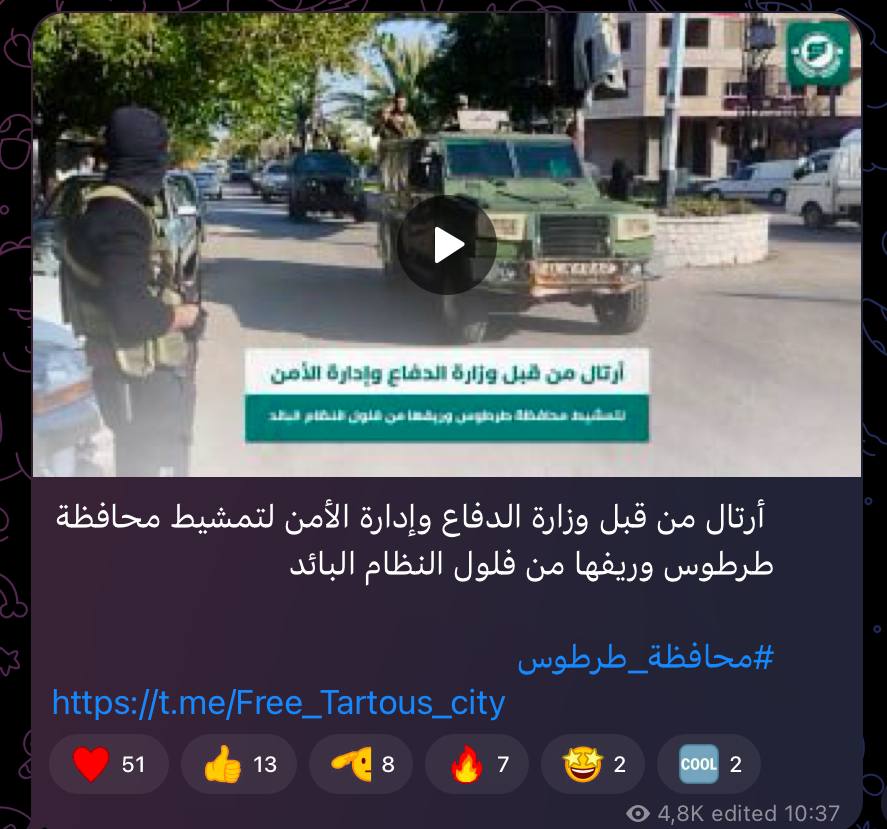One of the official channels of the #Ahmad_alSharaa ‘s #HTS militia on Telegram says in its latest news that the convoy will search #Tartous governorate and its countryside for “remnants” of the former regime. This is what we feared, a sectarian campaign in Tartous.
