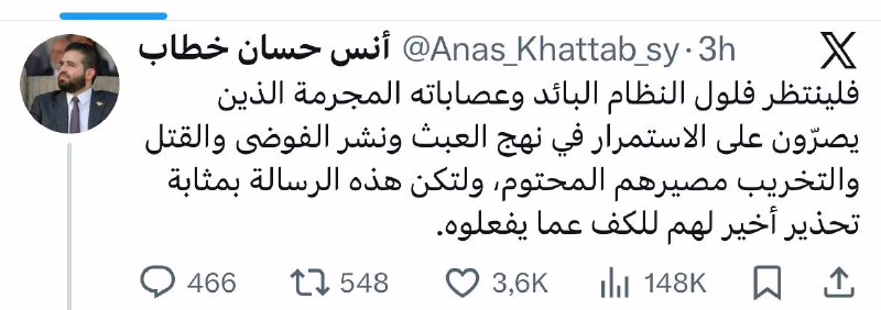 فيما وصف الإرهابي أنس خطاب أبناء الطائفة العلوية الذين شاركوا في المظاهرات بـ “الحمقى والمغفلين الذين ربطوا أنفسهم ببعض المجرمين الفارين”. وهدد أنس خطاب أبناء الطائفة العلوية وتوعدهم بمصيرهم المحتوم قائلاً: “فلينتظر فلول النظام البائد وعصابات الجولاني الإرهابية الذين يصرّون على الاستمرار في نهج العبث ونشر الفوضى والقتل والتخريب مصيرهم المحتوم، ولتكن هذه الرسالة بمثابة تحذير أخير لهم للكف عما يفعلوه.”
