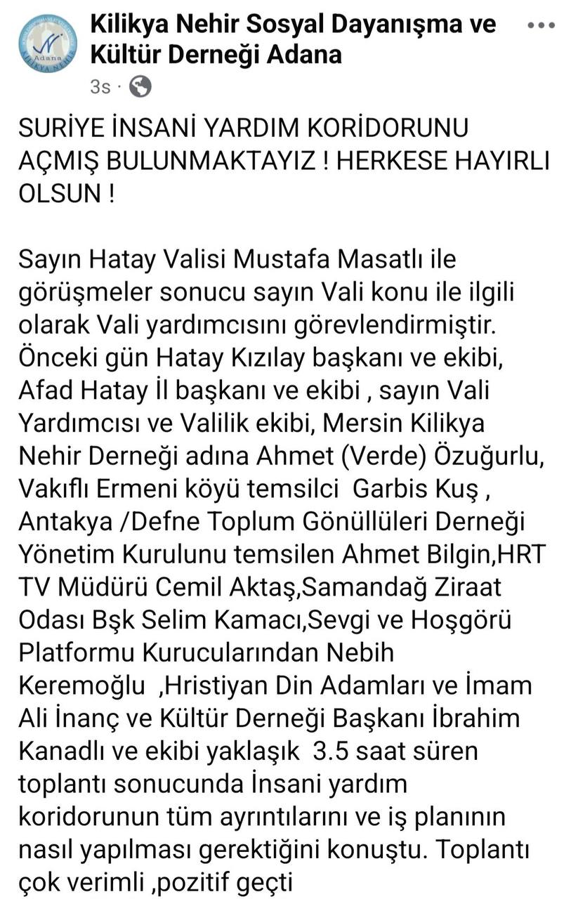تم الإعلان عن فتح ممر إنساني لإيصال المساعدات إلى سوريا، وذلك بالتنسيق مع الجهات الرسمية والجمعيات المدنية. وقد حضر الاجتماع الخاص بتنظيم هذه المبادرة ممثلون عن مؤسسات رسمية ومنظمات مجتمع مدني وفعاليات مختلفة. شارك في الاجتماع كل من رئيس الهلال الأحمر في هاتاي وفريقه، رئيس إدارة الكوارث والطوارئ (آفاد) في هاتاي وفريقه، ممثلون عن ولاية هاتاي، أحمد (فيردي) أوزوغورلو ممثلًا عن جمعية نهر كيليكيا في مرسين، غاربس قوش ممثل قرية وقفلي الأرمنية، أحمد بلجين ممثلًا عن مجلس إدارة جمعية متطوعي أنطاكيا/دفنة، جميل أكتاش مدير قناة HRT TV، سليم كماجي رئيس غرفة الزراعة في سمانداغ، نبيه كريموغلو من مؤسسي منصة المحبة والتسامح، وعدد من رجال الدين المسيحيين وشخصيات أخرى معنية. تم خلال الاجتماع مناقشة آلية عمل الممر الإنساني، ونقاط تسليم المساعدات، والخطة التي سيتم اتباعها لضمان وصول المساعدات إلى مستحقيها. وقد تم تحديد جمعية نهر كيليكيا كممثل للحملة في مرسين، ومنصة العلويين في أضنة كممثل لها في أضنة.