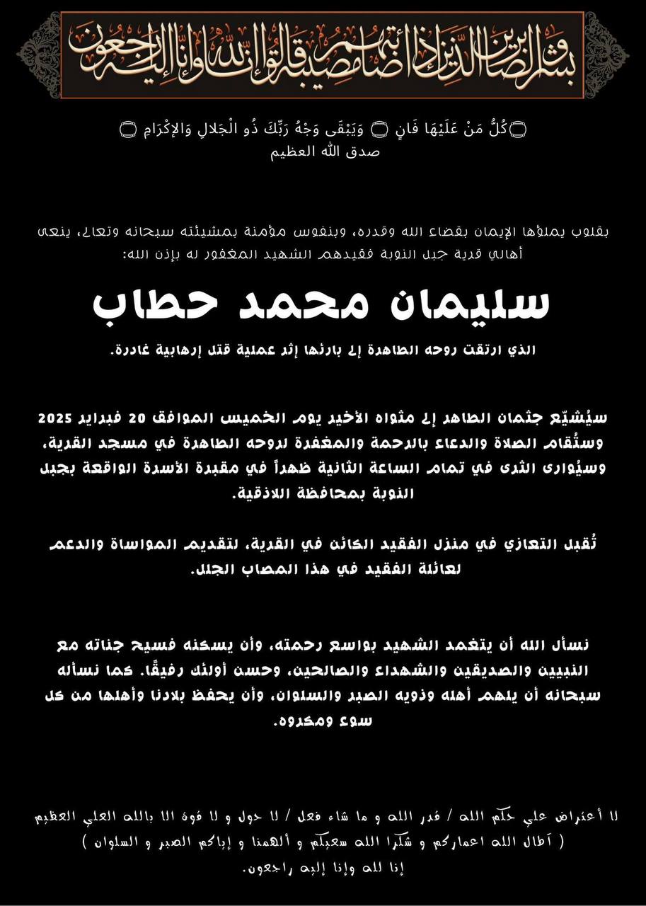Mr. Suleiman Hatab was originally from #Jabal_alNuba village. The people of his village have accused the #HTS militia and pointed out the lack of an effective security response from what is known as “General Security” in dealing with the incident.