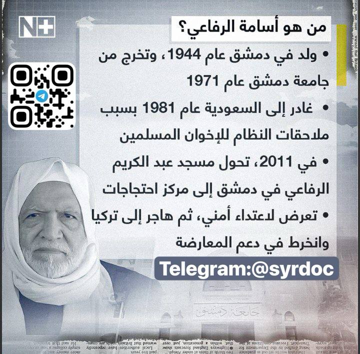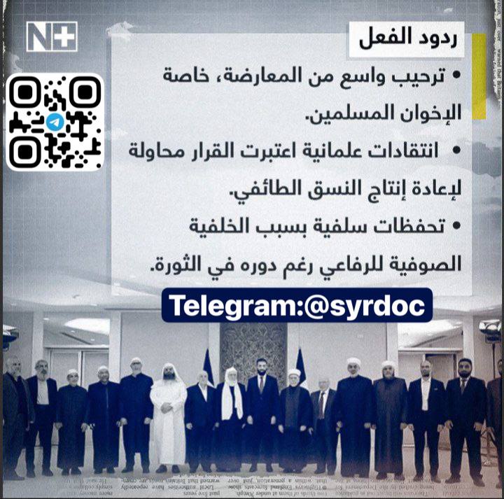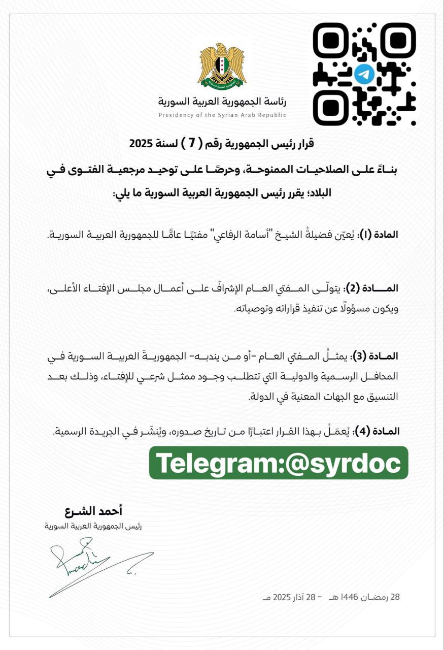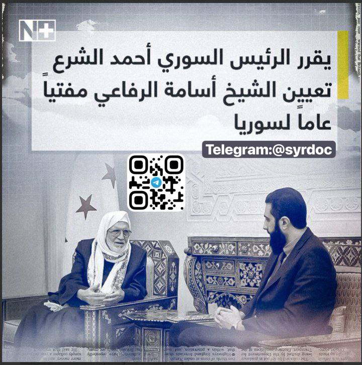 ⇚ تعيين أسامة الرفاعي مفتياً لسوريا يثير الجدل، إذ يُعرف بمواقفه التحريضية وفتاواه التي بررت الهجمات على المناطق الكوردية والاستيلاء على ممتلكاتهم خلال احتلال عفرين عام 2018. كما توثق فيديوهات مسجلة تحريضه ضد الطوائف والمكونات الدينية، وخصوصًا ضد الشيعة، ما يعكس استمرار سياسات الإقصاء والطائفية على حساب التنوع السوري