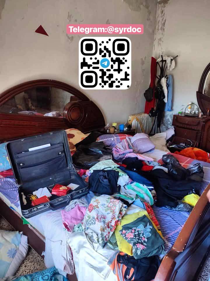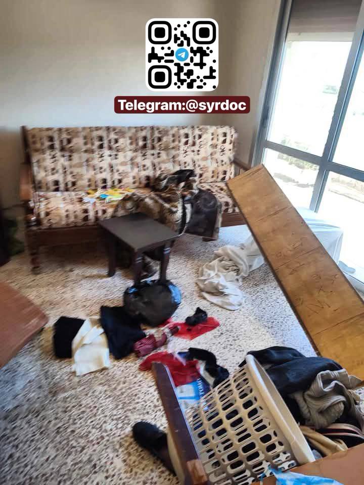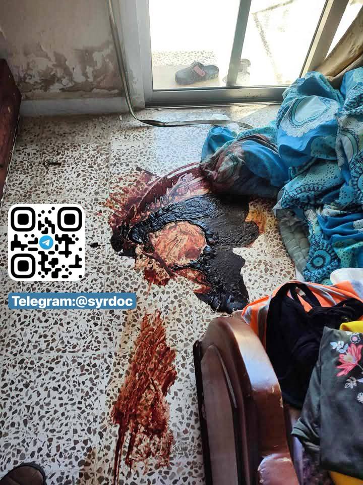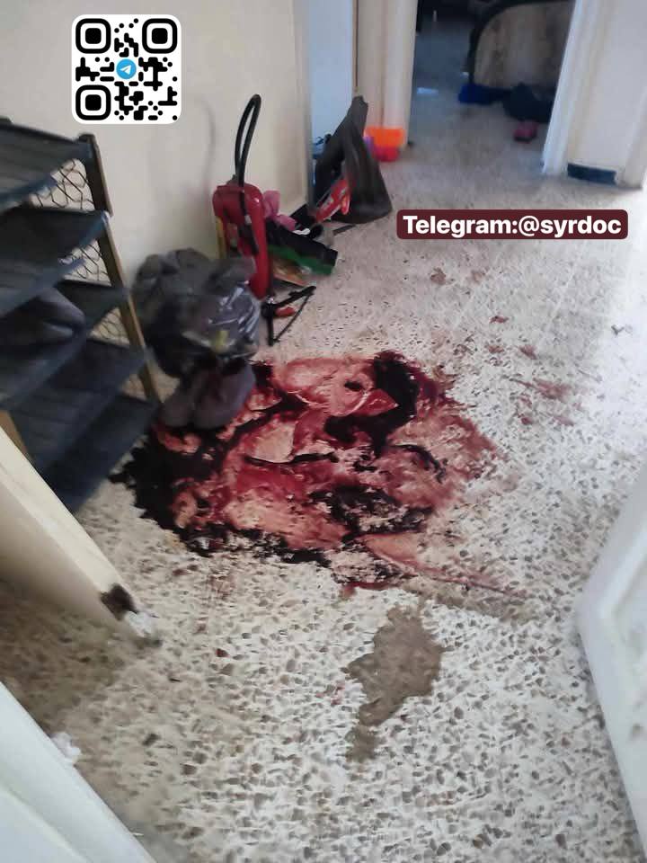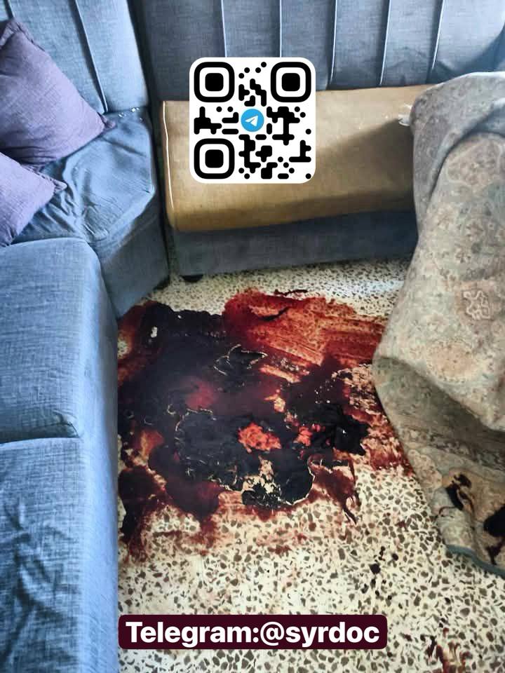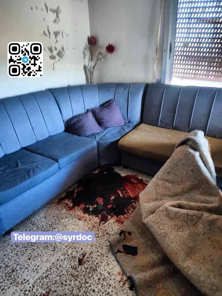 بعد إزالة الجثث فبقع الدم لا تزال شاهدة، والجدران تنطق برسائل تهديد تركها عناصر عصابات الجولاني الإرهابية و الامن العام، تزرع الخوف وتؤكد استمرارهم بالإباده العرقيه.