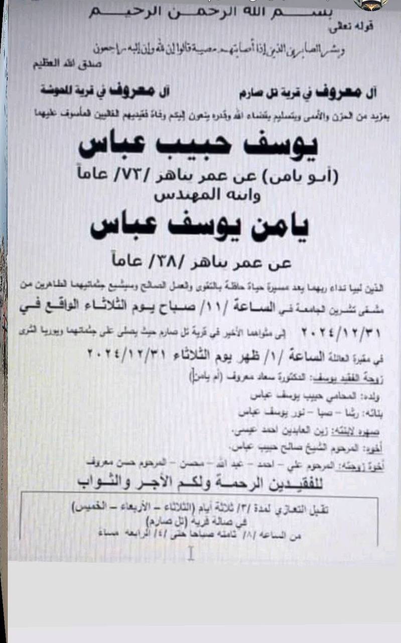 وبعدها انقطعت الأخبار مع السيد عباس وابنه (منذ 13.12.24) ، اليوم عثر على جثتين في مشفى “تشرين الجامعي” في #اللاذقية للسيد يوسف عباس وابنه.