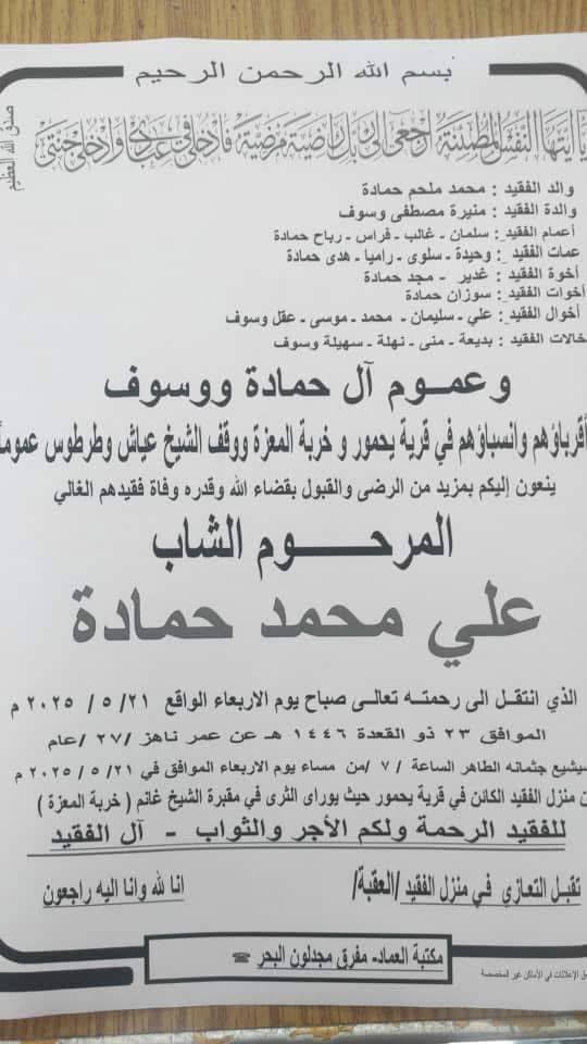 -عُثر على جثمان الشاب علي محمد حمادة، 27 عاماً، بعد اختطافه منذ ثلاثة أيام من قبل عناصر عصابات الجولاني الإرهابية الجهادي التابع لتنظيم عصابات الجولاني الإرهابية، من أمام منزله في قرية يحمور بريف محافظة طرطوس