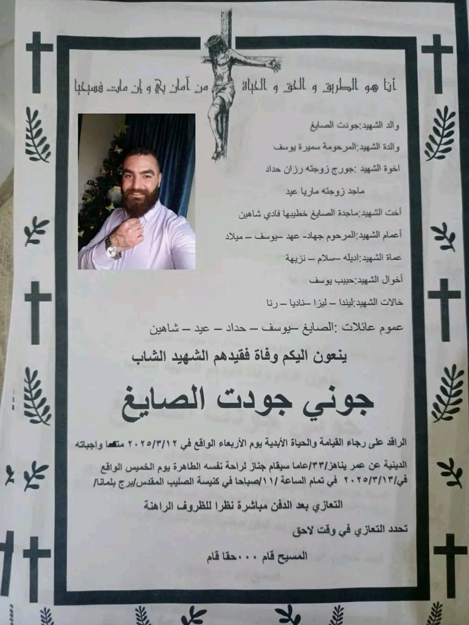 استشهاد الشاب “جوني جودت الصايغ”، مسيحي، بعد قنصه اليوم في مدينة بانياس أثناء تنقله على دراجته النارية مع خطيبته، يرجح أنه قنص لأن خطيبته لاترتدي الحجاب وهذا أصبح سباباً كافي لتقتل في سوريا