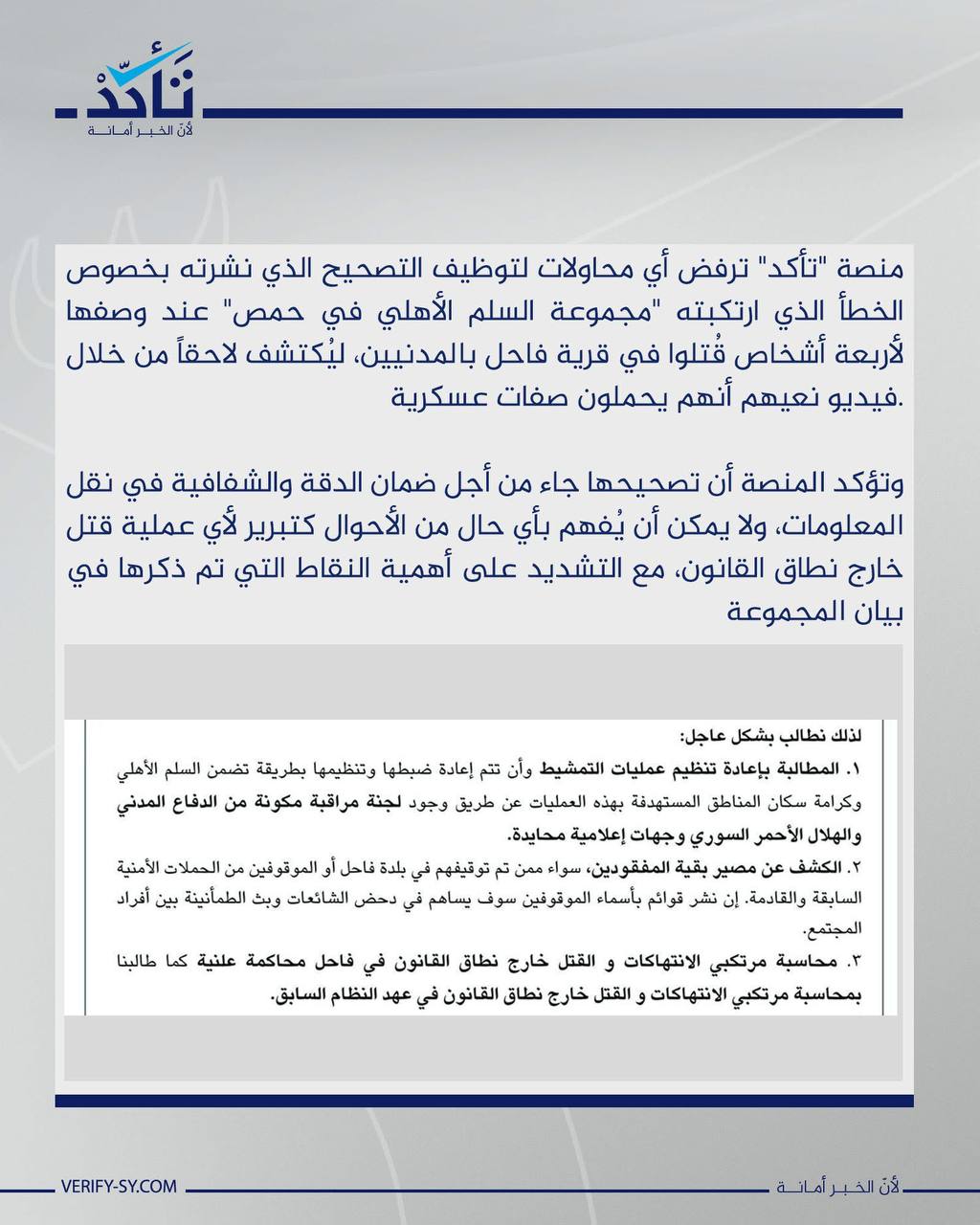 أحمد بريمو صاحب منصّة تأكد كلامي إلك بتعرف تمام المعرفة انو في ناس ماتت ظلم كتير بهالحملة ومدنيين مادخلهم وكتير ناس بتوثق بصفحتك لكن مع الأسف عم تبدا تقّل مصداقيتها بظل غياب الإعلام الرسمي منيح انك نشرت ه الخبر وبررت الموقف وعرفت أنك على غلط