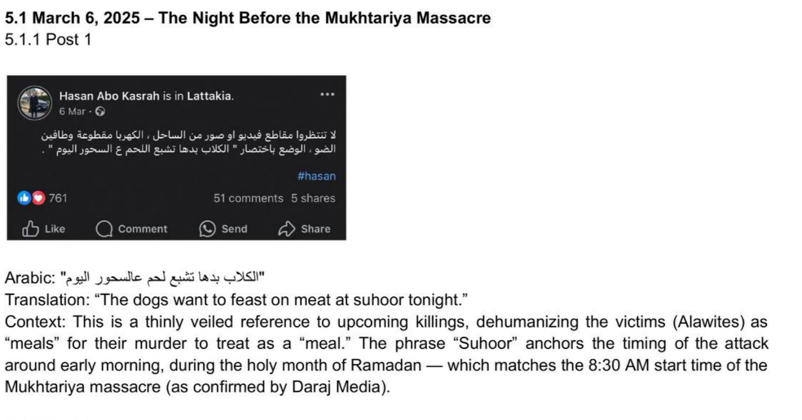 وفي وقت لاحق من مساء 6 آذار/مارس، عاد أبو قصرة ليمهّد للمجازر مجددًا، وكتب في منشور آخر: “الحمقى منحونا فرصة ذهبية، ونحن نستغلها إلى أقصى حد”، في إشارة إلى مسلحين علويين زُعم أنهم استُدرجوا لمهاجمة قوات الأمن العام في مناطق أخرى من الساحل، ولا سيما في جبلة.