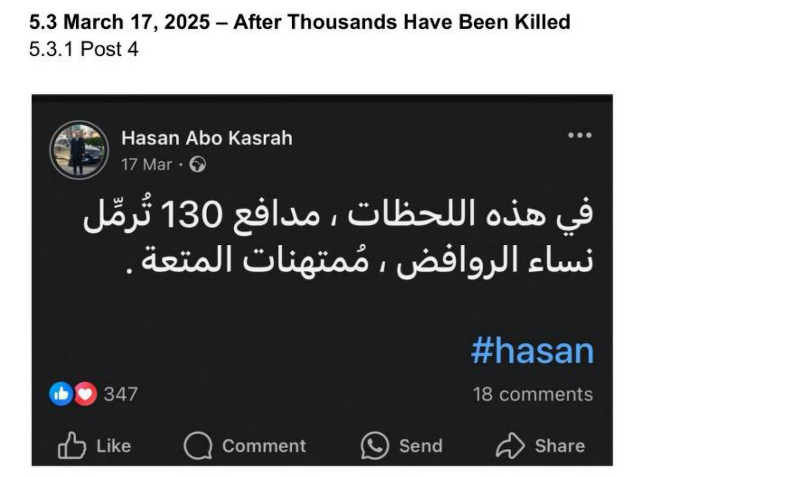 وبعد أيام قليلة، عاد أبو قصرة إلى وسائل التواصل الاجتماعي ليسخر من أرامل الرجال الذين ذبحهم جنوده، وكتب: “مدافع 130 ملم تحوّل نساء الروافض إلى أرامل عاهرات المتعة”.