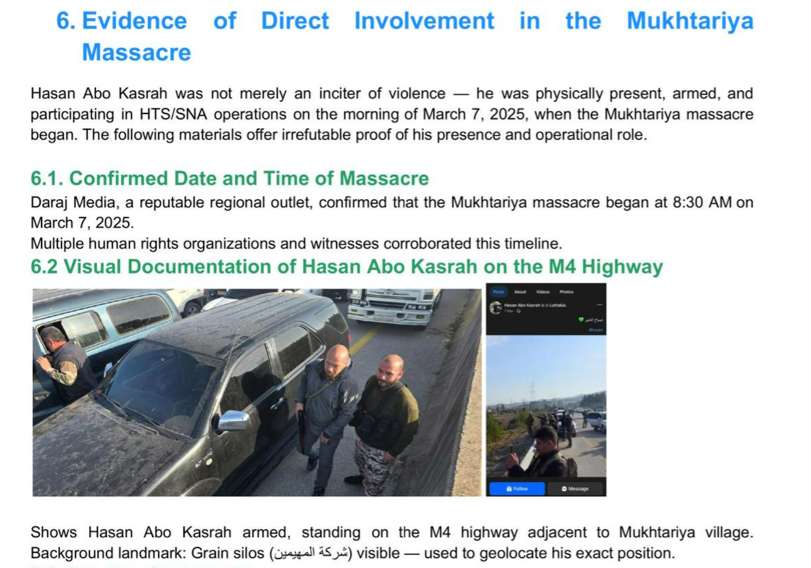 وتُظهر أدلة منشورة على وسائل التواصل الاجتماعي أن حسن أبو قصرة، وهو شخصية نافذة في هيئة تحرير الشام (HTS)، كان حاضرًا في المختارية وقت المجزرة وقدم دعمًا لوجستيًا، وهو ابن عم وزير الدفاع السوري مرهف أبو قصرة.