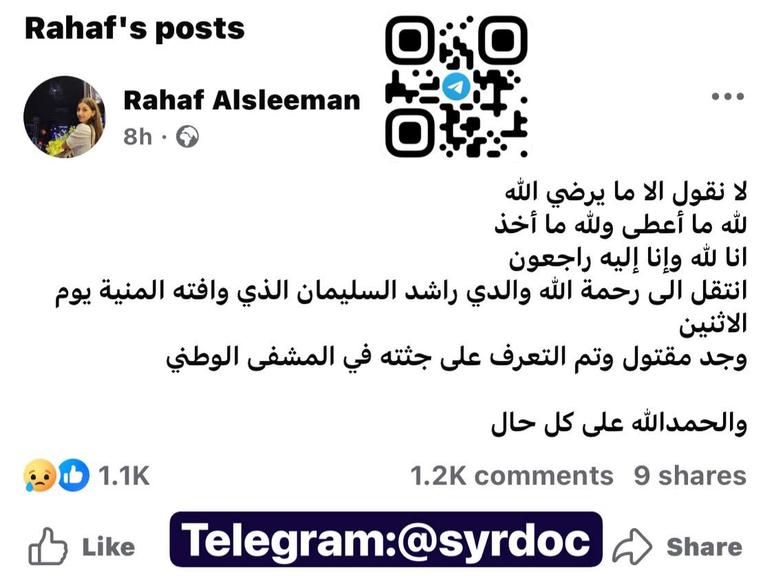 فقط في سورية، يُخطف أباك الأعزل سائق تكسي الباحث عن لقمة العيش ليصلك خبر العثور على جثته بعد عدة أيام.. رهف السليمان تنعي والدها الشهيد راشد السليمان اليوم و هو من الطائفه العلوية الرحمة لأرواح السوريين … الاباده العرقيه الجماعيه مستمره و العالم يتفرج.