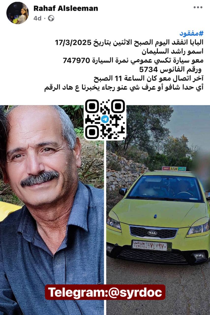 In Syria, only here, a defenseless father—just a taxi driver seeking to earn a living—is abducted, and days later, his lifeless body is found. Rahaf Alsleeman mourns the loss of her father, the martyr Rashid Alsleeman, from the Alawite sect. May his soul rest in peace, along with all the innocent souls of Syria. The ethnic genocide continues unabated, while the world remains indifferent.