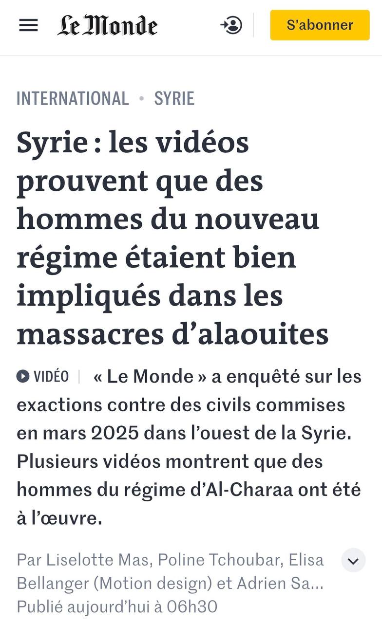 تقارير نشرتها القناة الفرنسية الأولى وصحيفة “لوموند” ذات الإنتشار العالمي تفيد بتورّط فصائل عسكرية مقرّبة من الرئيس الانتقالي أحمد الشرع في المجازر التي وقعت في الساحل السوري خلال شهر آذار الماضي.