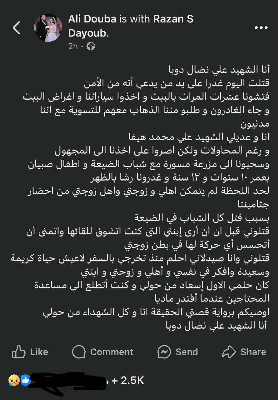 ”أنا الشهيد علي نضال دوبا قتلت اليوم غدرا على يد من يدعي أنه من الأمن فتشونا عشرات المرات بالبيت و اخذوا سياراتنا و اغراض البيت و جاء الغادرون و طلبو مننا الذهاب معهم للتسوية مع اننا مدنيون انا و عديلي الشهيد علي محمد هيفا و رغم المحاولات ولكن اصروا على اخذنا الى المجهول وسحبونا الى مزرعة مسورة مع شباب الضيعة و اطفال صبيان بعمر ١٠ سنوات و ١٢ سنة و غدرونا رشا بالظهر لحد اللحظة لم يتمكن اهلي و زوجتي واهل زوجتي من احضار جثاميننا بسبب قتل كل الشباب في الضيعة قتلوني قبل ان أن أرى إبنتي التى كنت اتشوق للقائها واتمنى أن أتحسس أي حركة لها في بطن زوجتي قتلوني وانا صيدلاني احلم منذ تخرجي بالسفر لاعيش حياة كريمة وسعيدة وافكر في نفسي و أهلي و زوجتي و ابنتي كان حلمي الاول إسعاد من حولي و كنت أتطلع الى مساعدة المحتاجين عندما أقتدر ماديا اوصيكم برواية قصتي الحقيقة انا و كل الشهداء من حولي أنا الشهيد علي نضال دوبا”