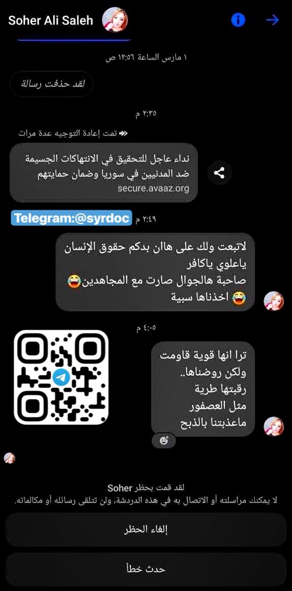 Incident: Suhair Ali Saleh, an Alawite woman, was raped and slaughtered after being taken captive by HTS militants. Using her own phone, they sent messages via Messenger to her relatives, informing them that she had become a slave. Words fail us in describing such a horrific crime.