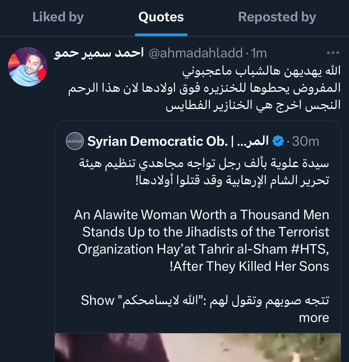 Just to give an idea of the kind of the Syrians who support the #HTS regime, here’s a quote from yesterday when I posted the video of the Alawite woman facing the jihadists. The quote says, ‘May Allah guide them, I don’t like them, because they should have put this pig with her children, as this defiled womb brought these pigs.’
