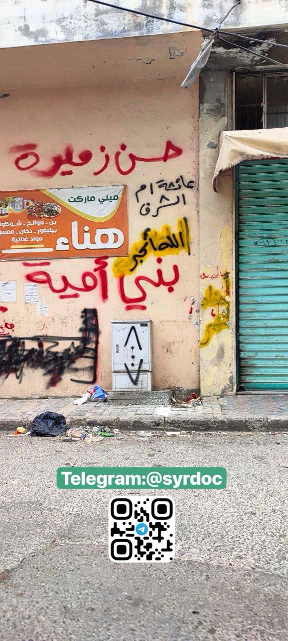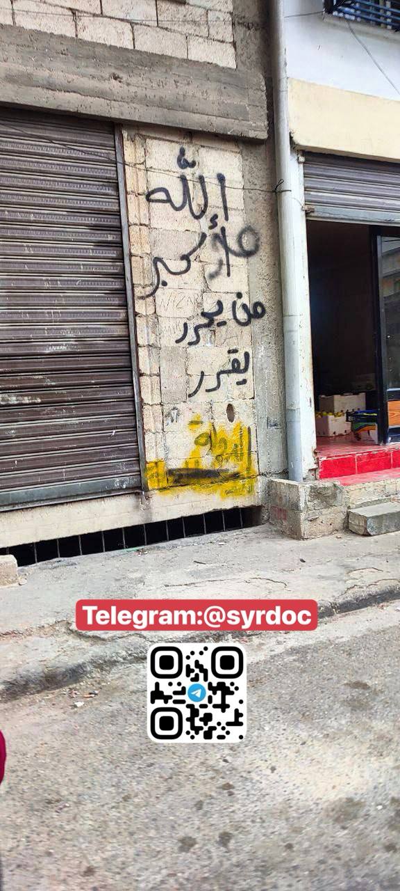 Graffiti with inflammatory and divisive rhetoric has appeared on the walls of Tartous, allegedly linked to HTS affiliates. Such acts constitute a blatant violation of laws against incitement and pose a serious threat to social cohesion.