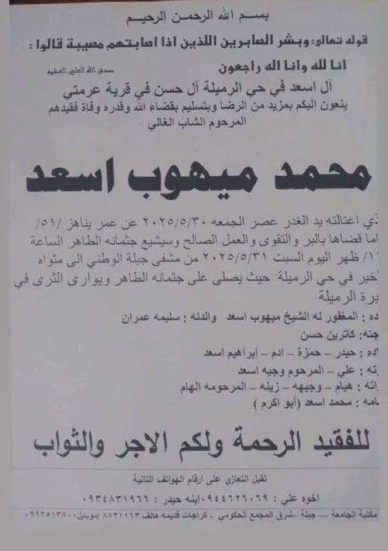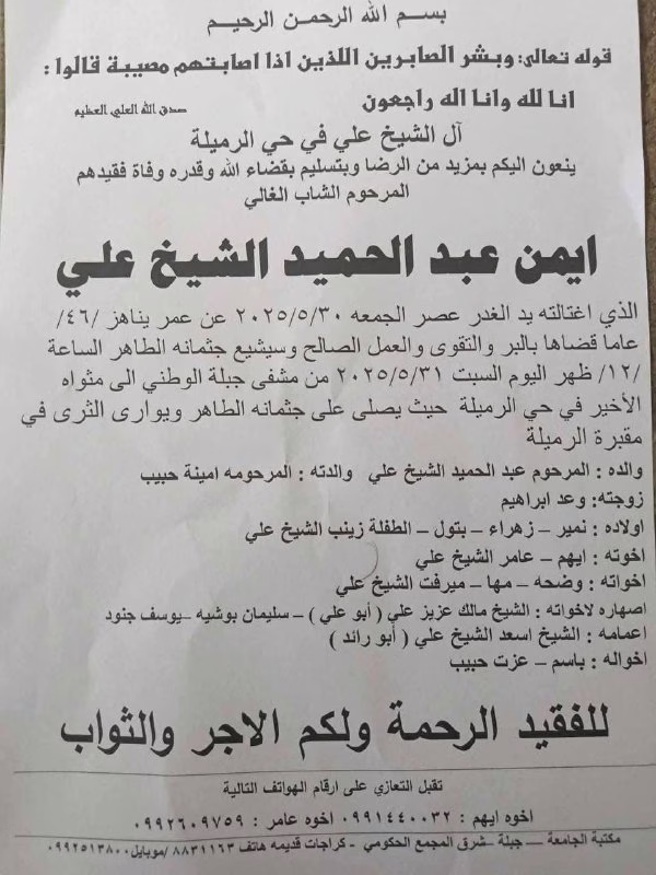 جبلة | الرميلة: استشهد كل من “أيمن عبد الحميد الشيخ علي”، 46 عاماً، و”محمد ميهوب أسعد”، 51 عاماً، يوم أمس 30 أيار/مايو برصاص يد الغدر.