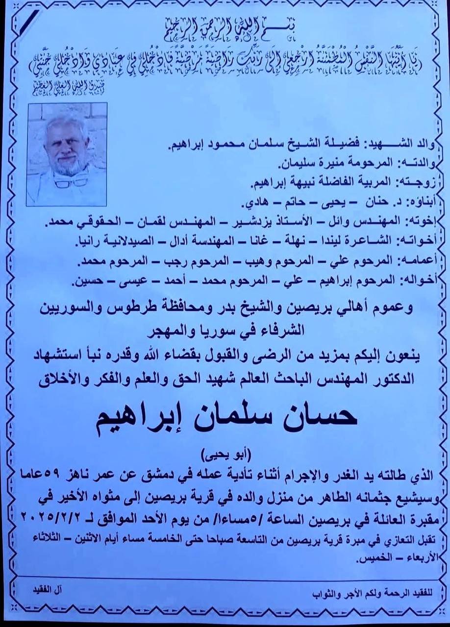 تلقى الدكتور إبراهيم اتصالًا من النظام الجهادي في #دمشق، حيث طُلب منه العودة إلى عمله، مع تقديم وعود وضمانات حول سلامته. إلا أنه، وبعد وصوله إلى مكان عمله، تعرض للاختطاف من قبل ميلشيا #الجولاني لمدة خمسة أيام، قبل أن يُعثر على جثمانه مقتولًا برصاصة في الرأس (إعدام ميداني) في منطقة بين #معربا وجبل قاسيون في العاصمة #دمشق.