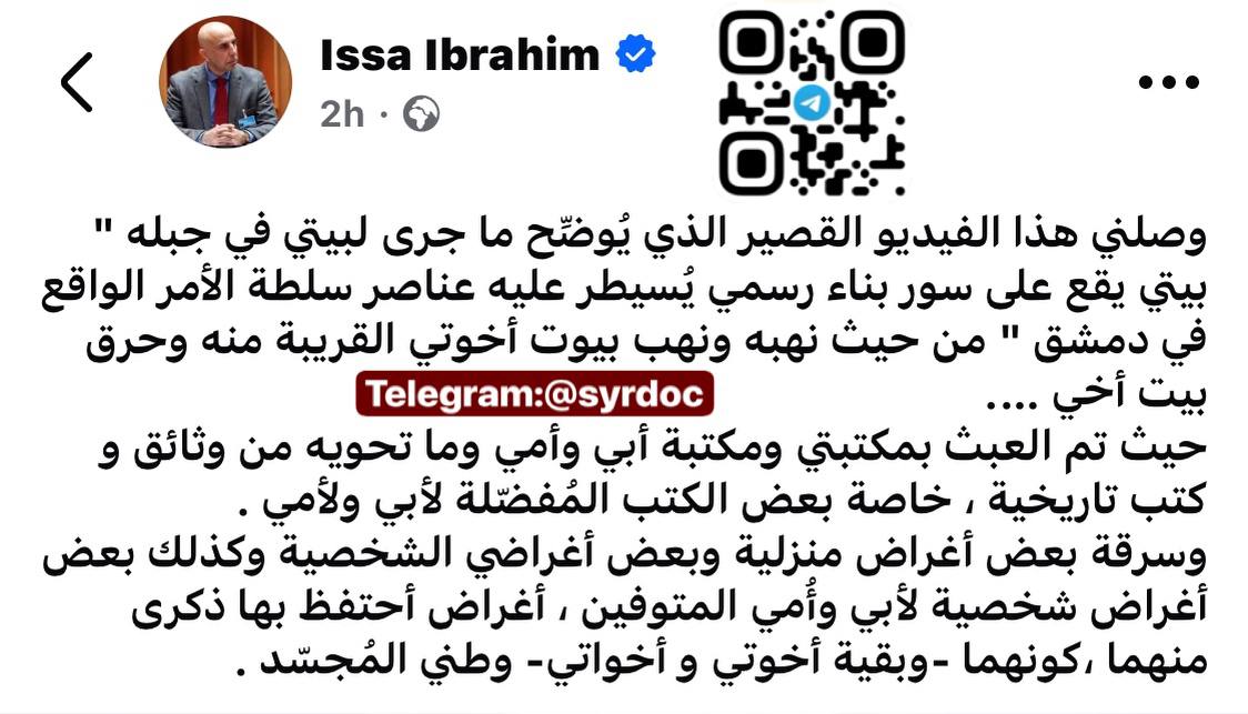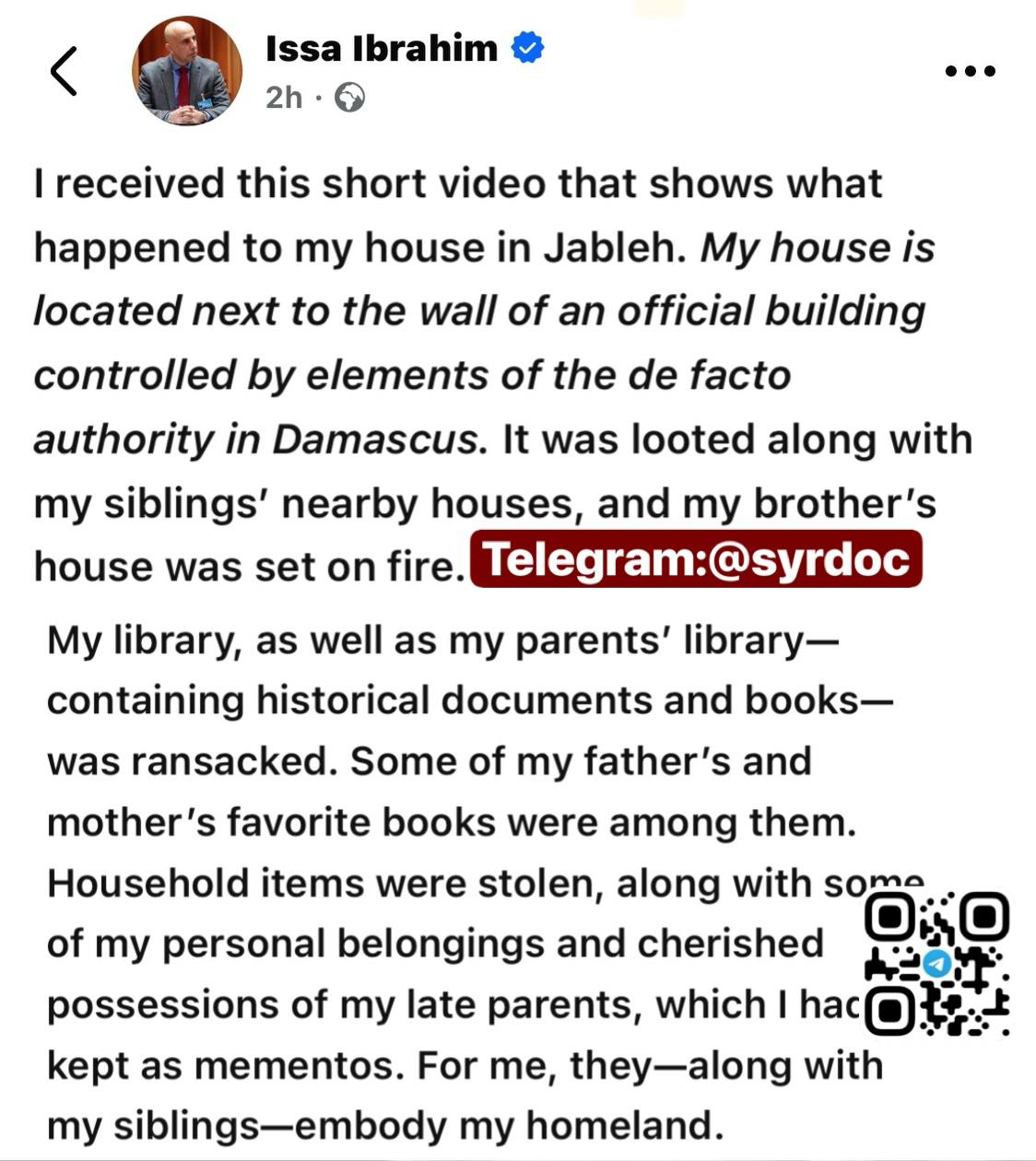 The home of lawyer Issa Ibrahim and those of his siblings in Jableh were looted, while his brother’s house was set on fire, near an official building controlled by the de facto authorities in Damascus. His personal library and that of his late parents were ransacked, with historical documents and books destroyed. Personal belongings, household items, and cherished mementos of his deceased parents were also stolen.