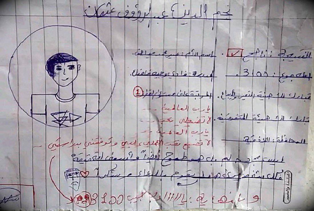واليوم هذه هي شهادته التي كتبها بيده قبل استشهاده وحلمه بالتفوق في شهادة التعليم الأساسي ولكن شهادته للأسف كانت بالدم….