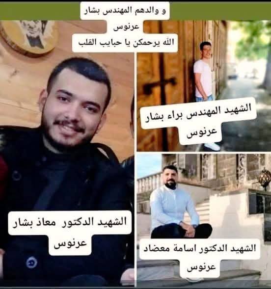الشهيد الدكتور معاذ بشار عرنوس الشهيد المهندس براء بشار عرنوس الشهيد الدكتور أسامة معضاد عرنوس