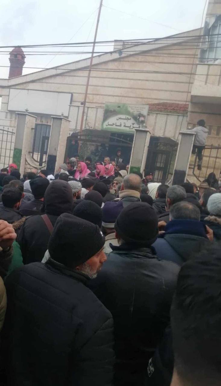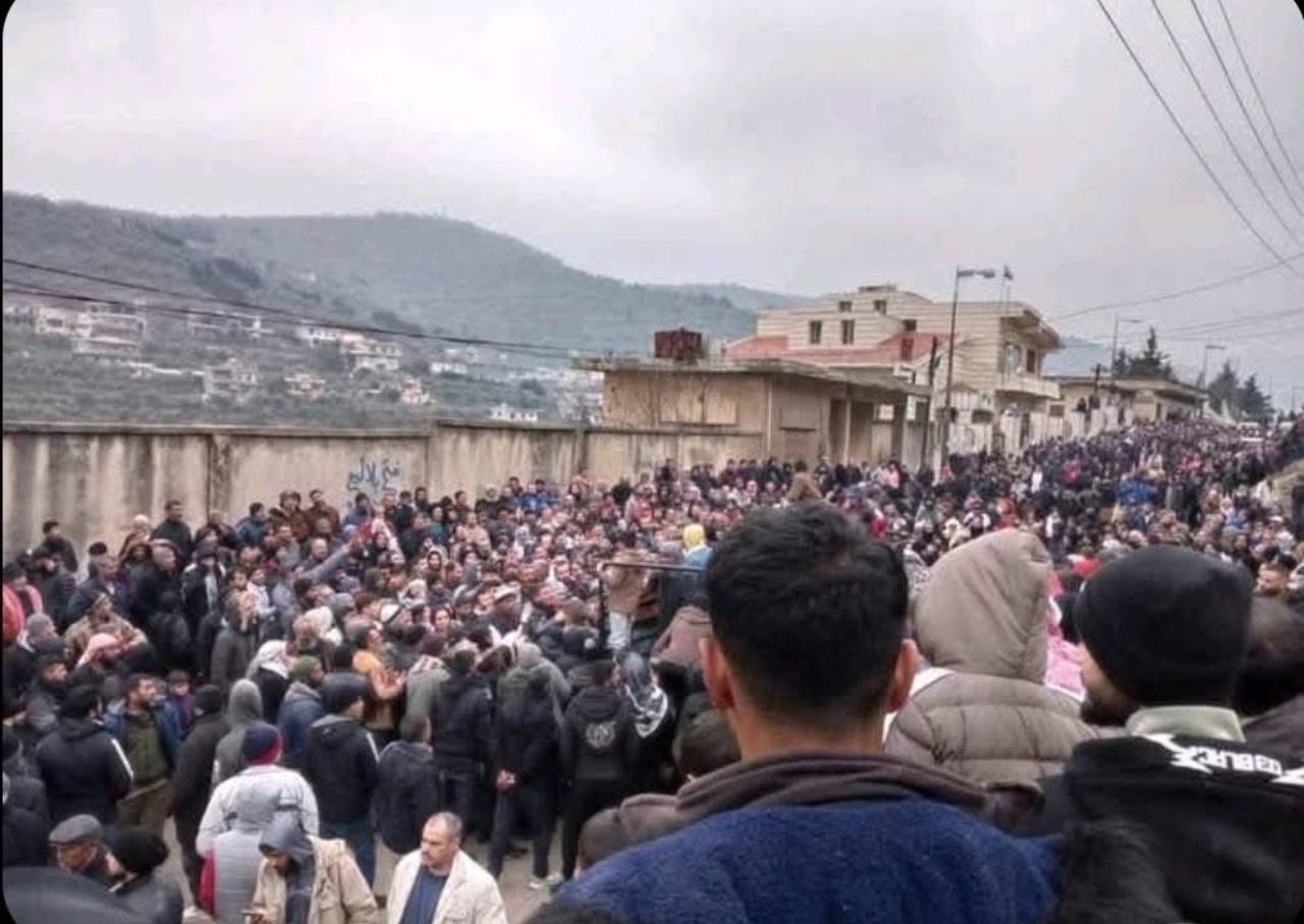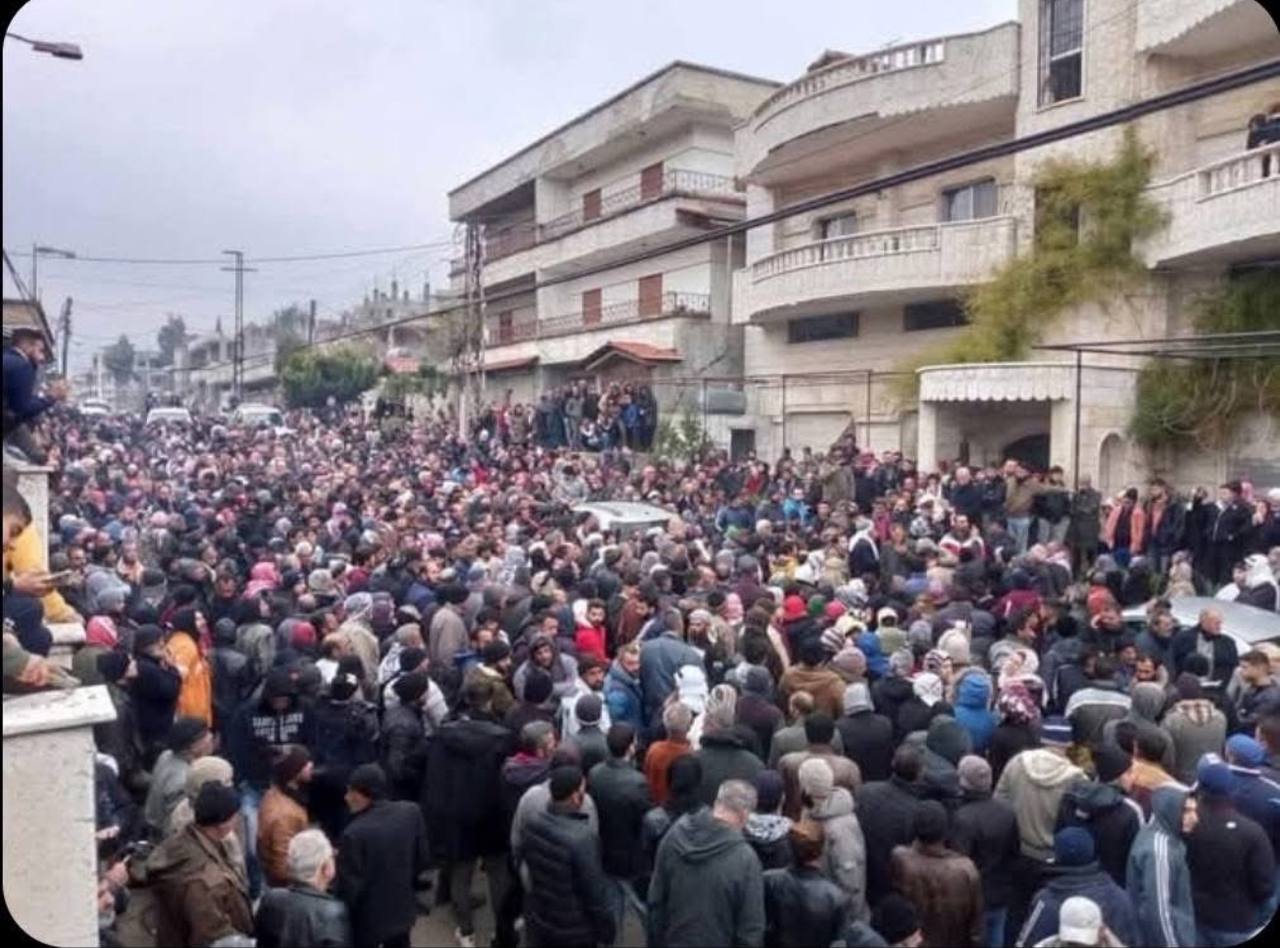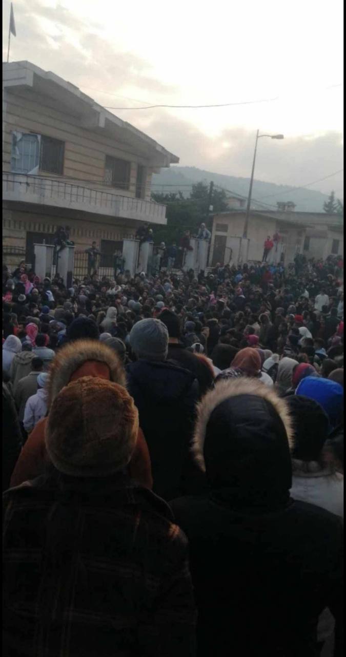 والأهالي معتصمين في القرية منذ عدة ساعات للمطالبة بجثامين أقربائهم وذلك لأن عناصر ميلشيا الجولاني تمنعهم من الاقتراب من الجثامين.