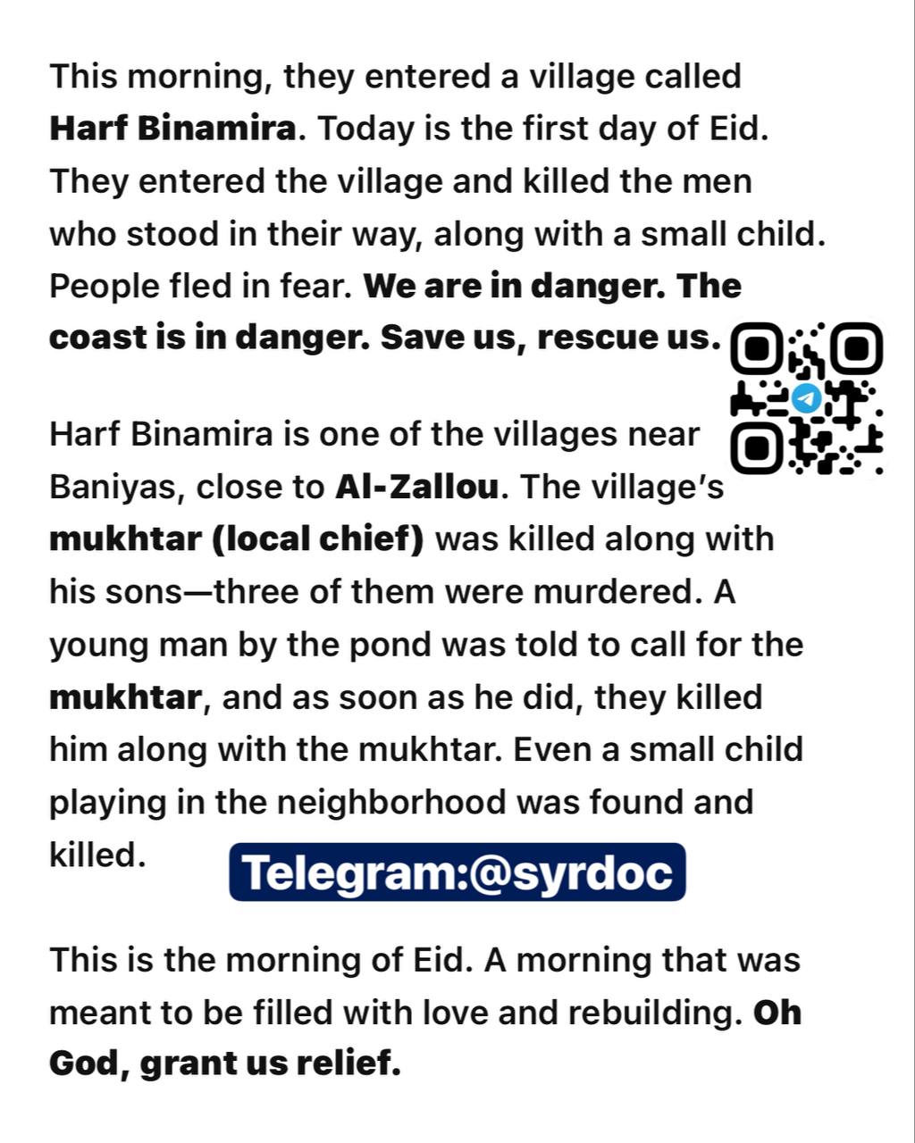 On Eid’s first day, Harf Bin Namra in rural Baniyas became the scene of a brutal massacre. The village mukhtar and several young men were killed, while children were left wounded—amid echoes of takbir.