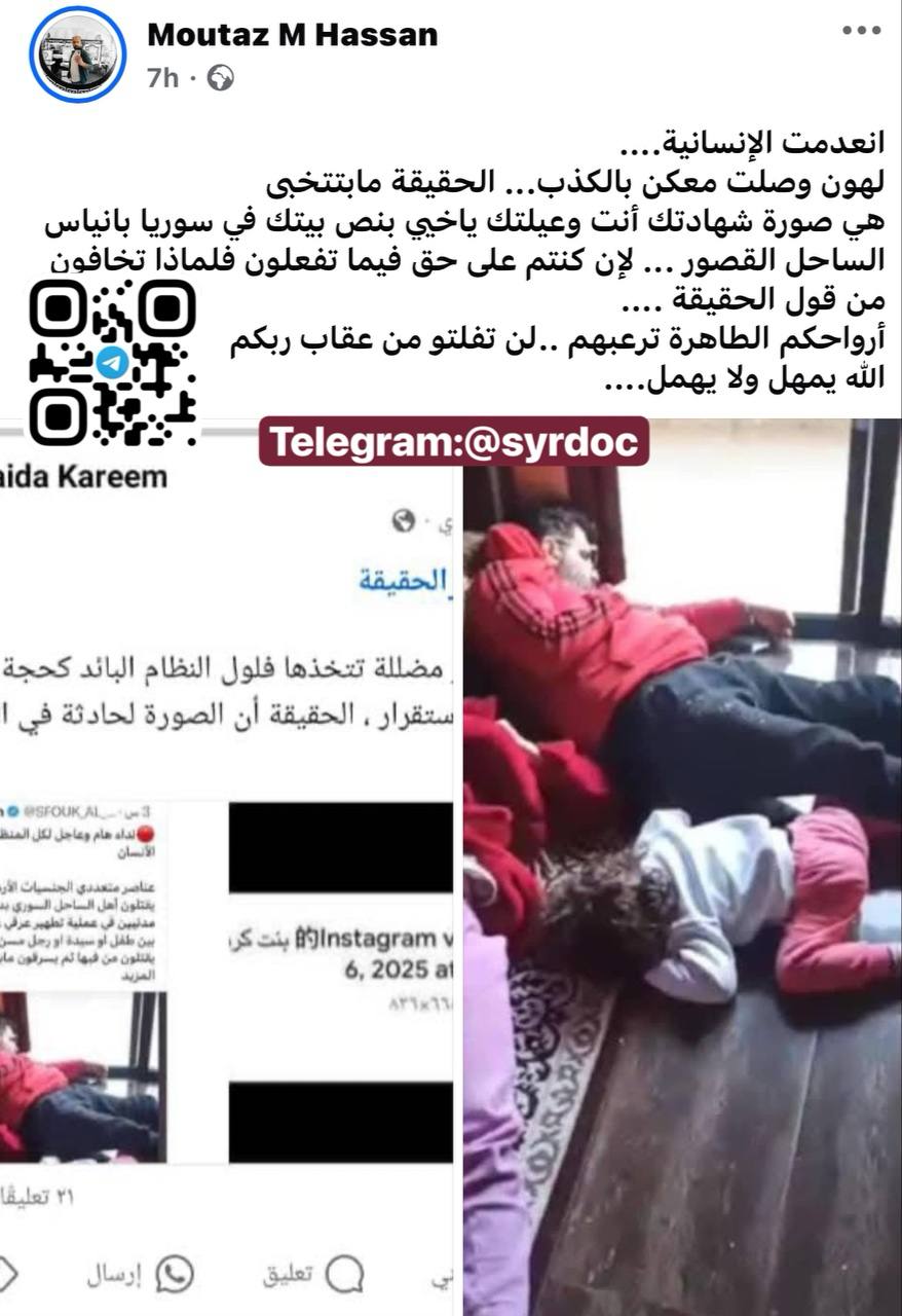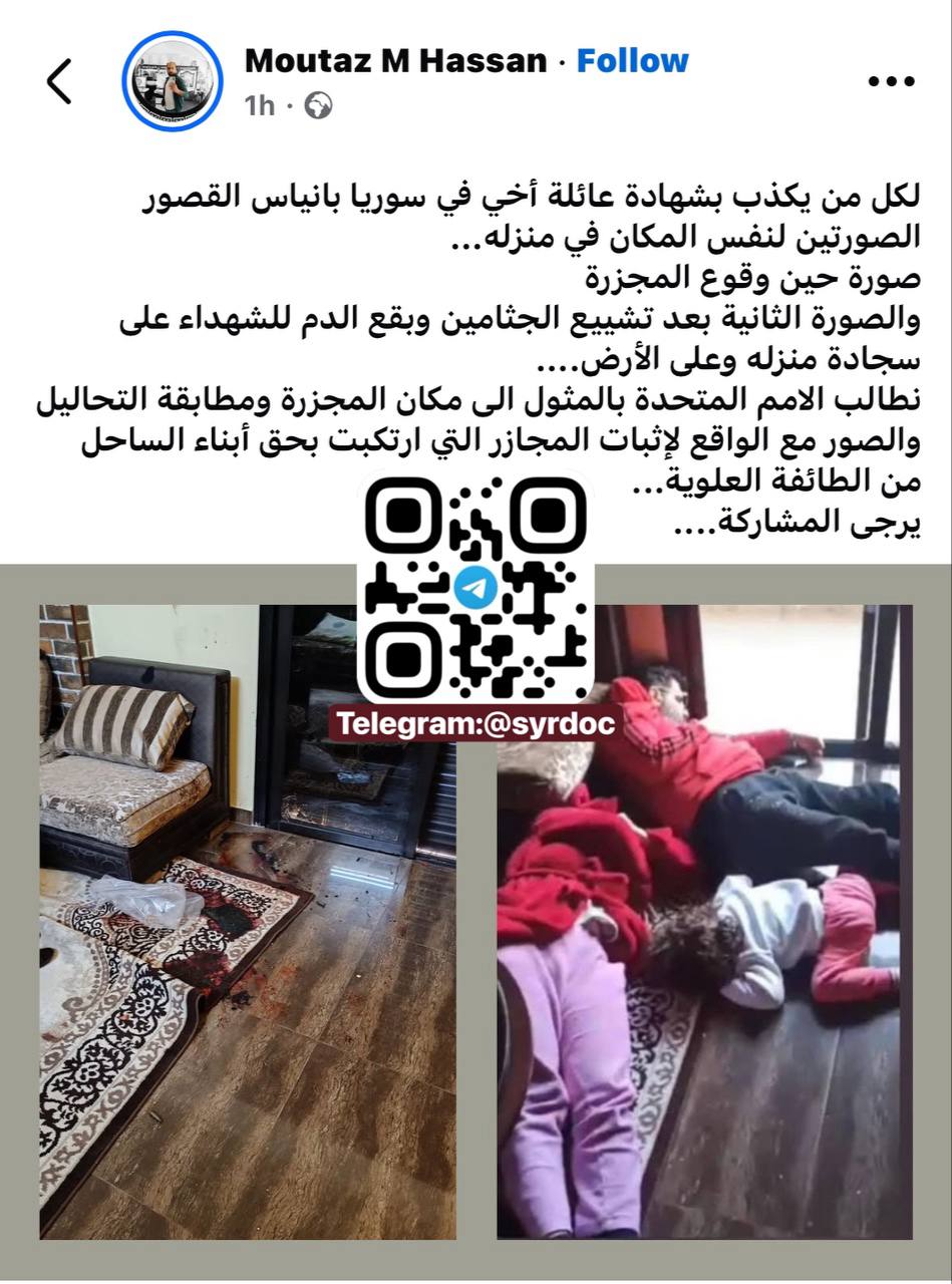 بينما يسعى البعض لتشويه الحقائق، يثبت معتز حسان المجزرة في بانياس القصور بنشره صورًا تظهر آثار الجريمة في منزل عائلته. الصور توثق اللحظات الدامية بعد وقوع المجزرة، مطالبًا الأمم المتحدة بالتحقق منها. في ظل محاولات التشكيك، فهو وضع حدًا لهذا الموضوع و نشر هذه الأدلة ليضع النقاط على الحروف.
