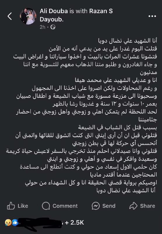 صيدلاني علوي يروي مأساة اغتياله على يد عصابات الجولاني الإرهابية في منشور مؤثر قبل استشهاده