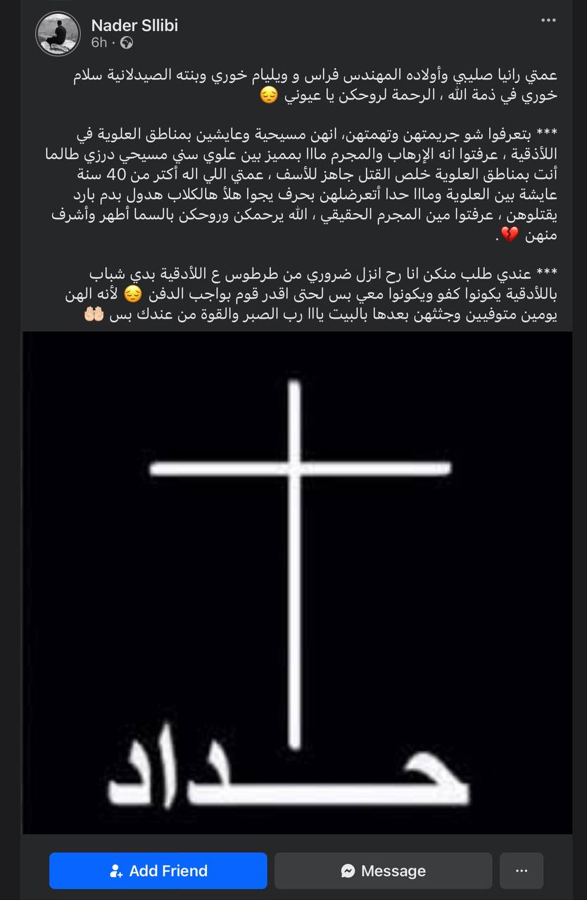 الشاب نادر صليبي، ينعي استشهاد عائلة عمته في مجازر اللاذقية ويقول أنه جريمتهم هي أنهن مسيحين ويعيشون في مناطق العلويين، كامل منشوره :