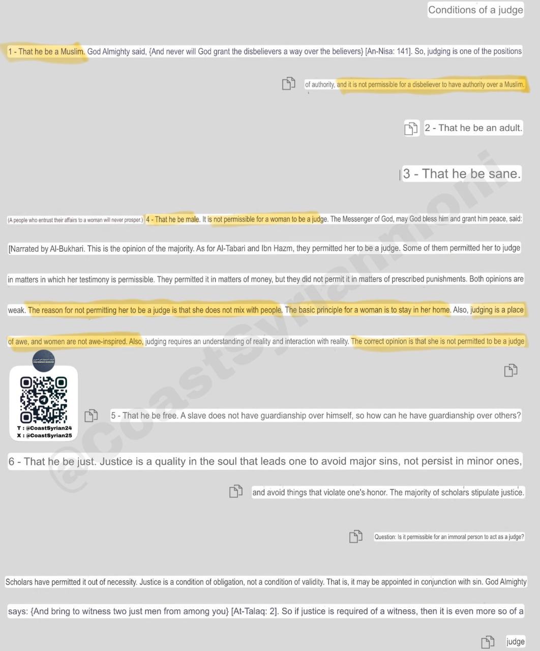 That the judge must be a Muslim; it is not permissible for an “infidel” to be a judge. According to his definition of an infidel in another book titled “Creed and Methodology Material”, infidels include Jews, Christians, esoteric sects, and apostates.