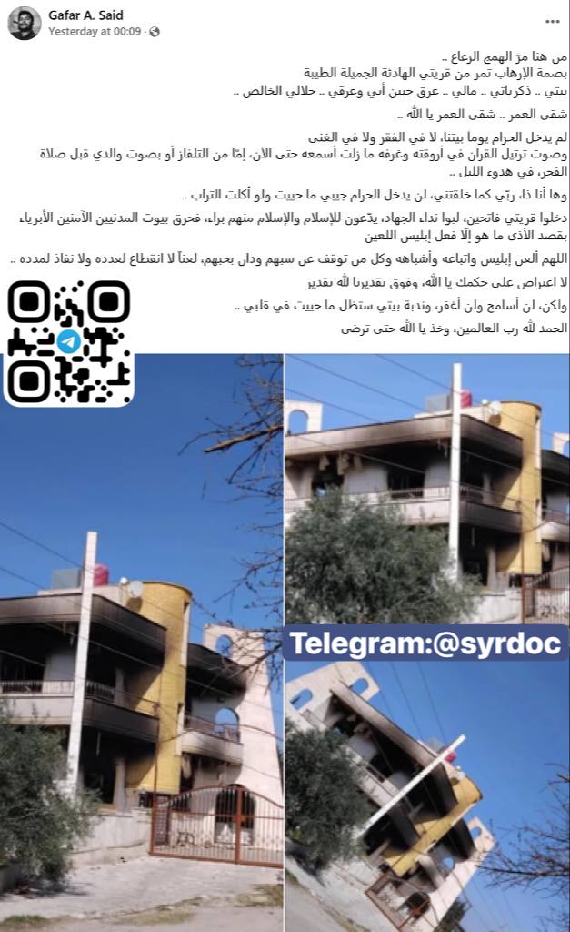A local resident shared his agony on Facebook, recounting the brutal attack on his village by HTS, General Security, and affiliated factions. He condemned the destruction of his home and the burning of innocent civilians’ houses, vowing never to forgive or forget the injustice inflicted upon them.
