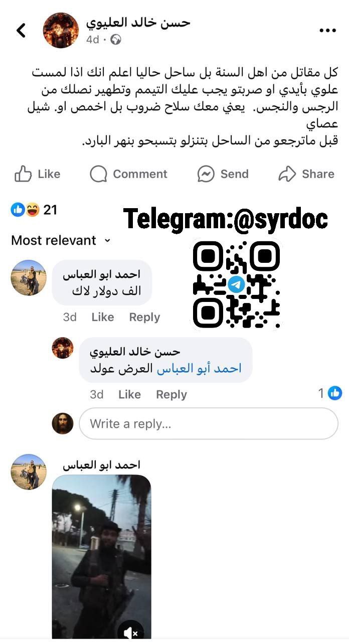 Hate speech and incitement to murder… A person insults Christian clergy, boasts about posts glorifying the killing of Alawite children for money, and continues to incite the extermination of Alawites.