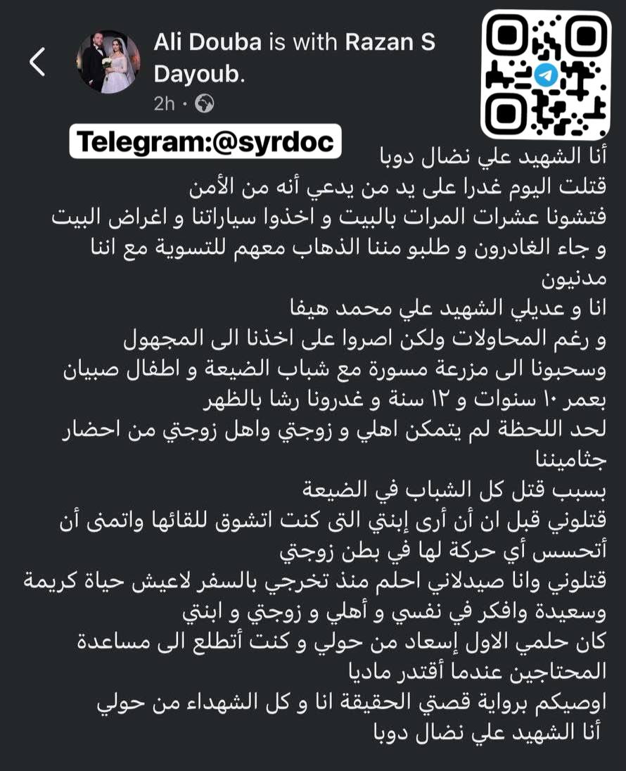 The wife of pharmacist Ali Doba, one of the martyrs from yesterday’s massacres, reported that this morning, his wife, pharmacist Razan Diop, was shot by HTS and is now between life and death.