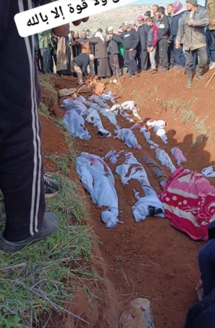 The residents of the village of #alTuwim in the countryside of #Hama are burying the victims of the #massacre in their village in mass graves due to the large number of martyrs.