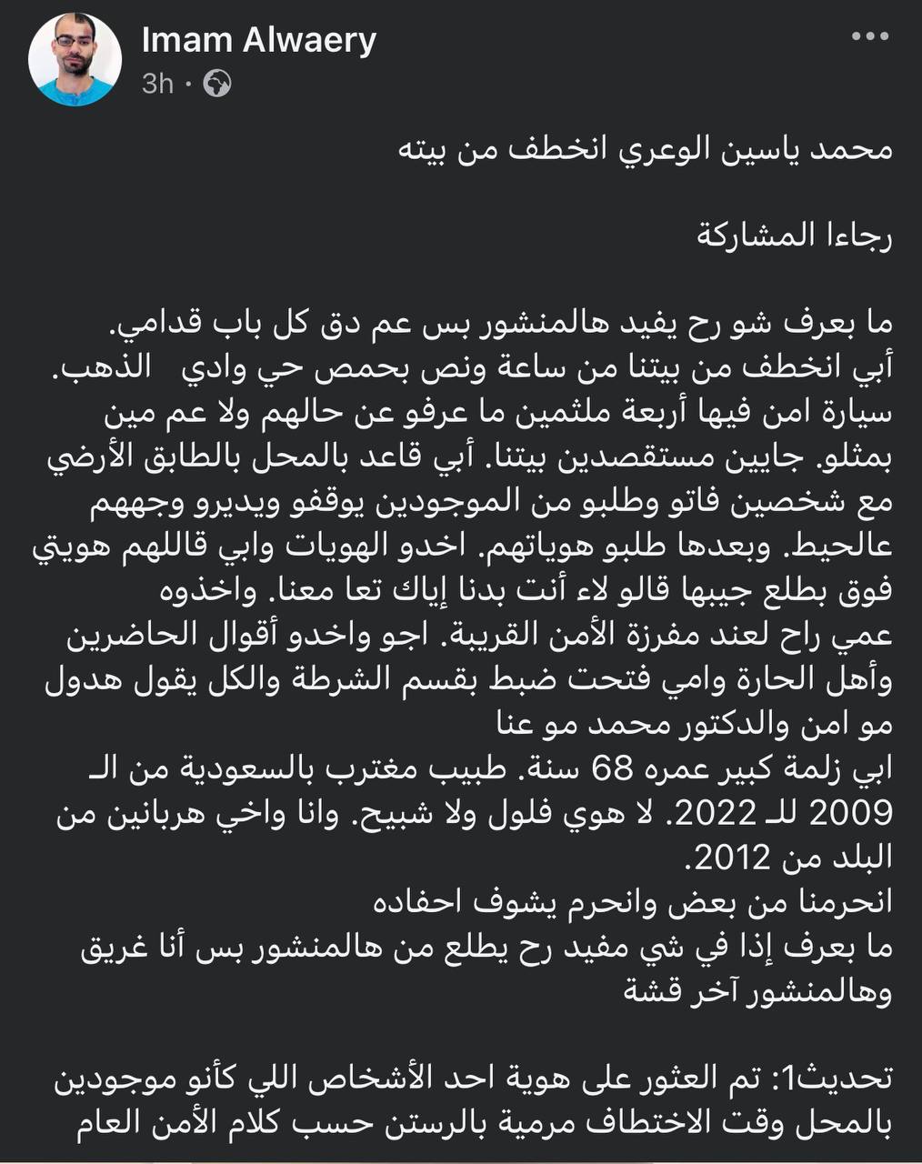 ”ما بعرف شو رح يفيد هالمنشور بس عم دق كل باب قدامي. أبي انخطف من بيتنا من ساعة ونص بحمص حي وادي الذهب. سيارة امن فيها أربعة ملثمين ما عرفو عن حالهم ولا عم مين بمثلو. جايين مستقصدين بيتنا. أبي قاعد بالمحل بالطابق الأرضي مع شخصين فاتو وطلبو من الموجودين يوقفو ويديرو وجههم عالحيط. وبعدها طلبو هوياتهم. اخدو الهويات وابي قاللهم هويتي فوق بطلع جيبها قالو لاء أنت بدنا إياك تعا معنا. واخذوه عمي راح لعند مفرزة الأمن القريبة. اجو واخدو أقوال الحاضرين وأهل الحارة وامي فتحت ضبط بقسم الشرطة والكل يقول هدول مو امن والدكتور محمد مو عنا ابي زلمة كبير عمره 68 سنة. طبيب مغترب بالسعودية من الـ 2009 للـ 2022. لا هوي فلول ولا شبيح. وانا واخي هربانين من البلد من 2012. انحرمنا من بعض وانحرم يشوف احفاده ما بعرف إذا في شي مفيد رح يطلع من هالمنشور بس أنا غريق وهالمنشور آخر قشة