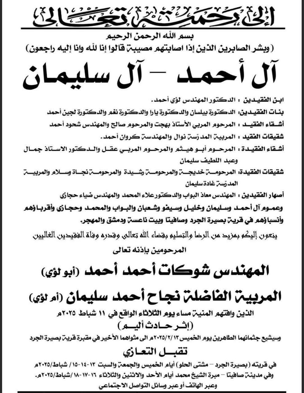 Shawkat Ahmad Ahmad and his wife Najah Suleiman were murdered in the village of Basira al-Jurd, in the countryside of #Safita, #Tartous Governorate.