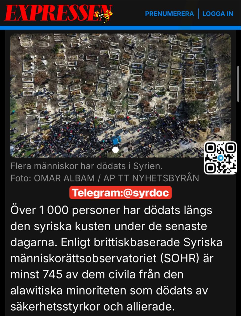 Swedish media reports: “Satellite imagery shows piled bodies along the Syrian coast, with reports confirming over 1,000 deaths, mostly Alawite civilians.”