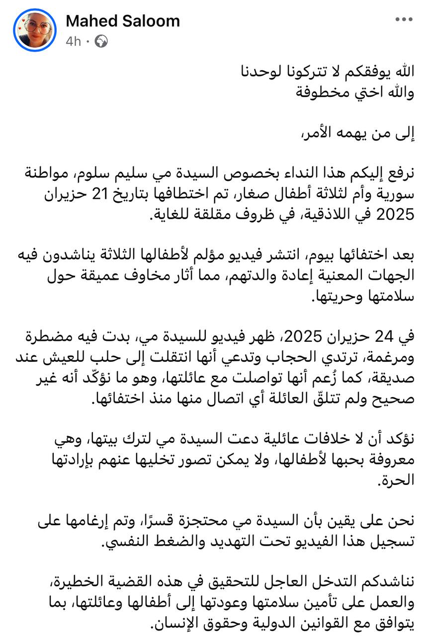 ء رسالة من” مهد سليم سلوم ” شقيقة المخطوفة مي سلوم