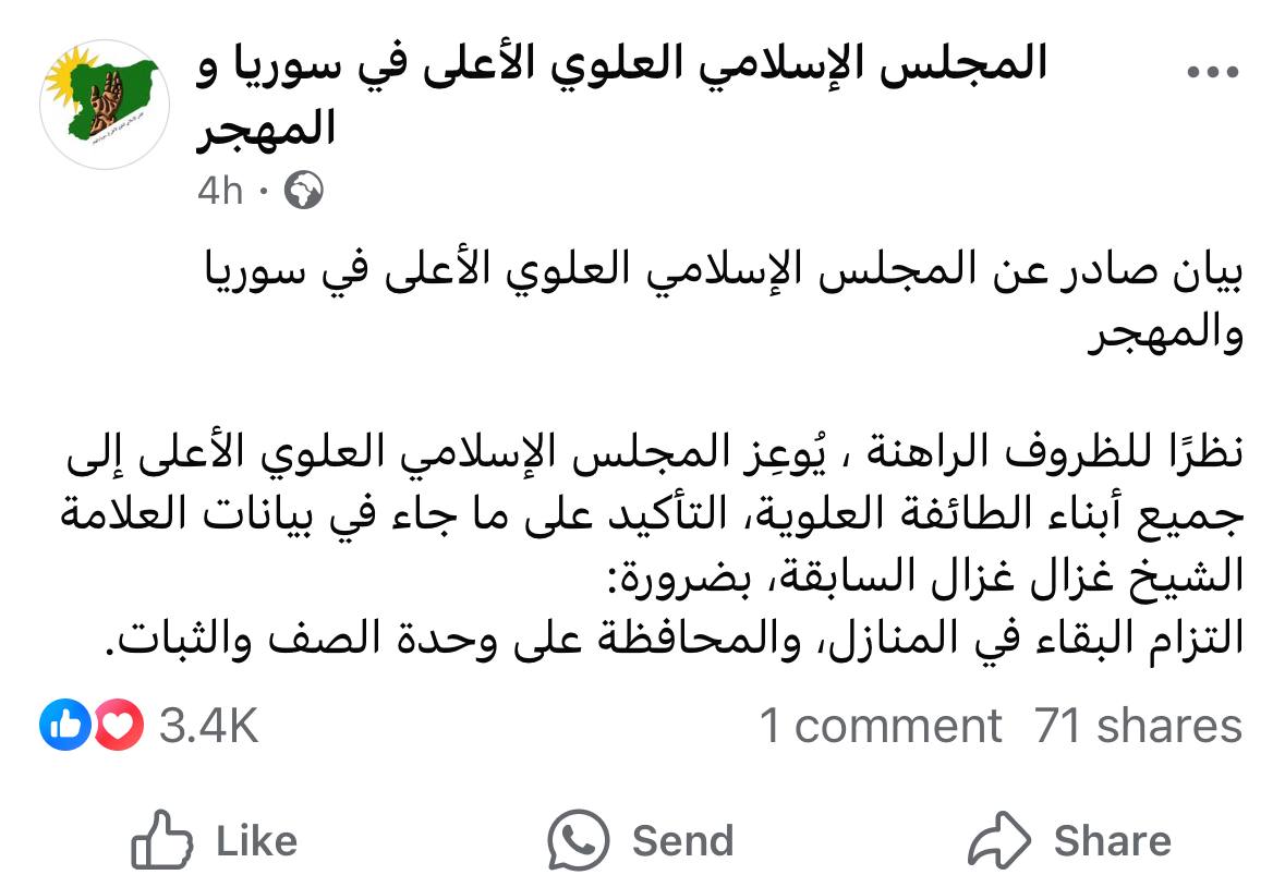 نظراً للظروف الراهنة ، يُوعِز المجلس الإسلامي العلوي الأعلى إلى جميع أبناء الطائفة العلوية، التأكيد على ما جاء في بيانات العلامة الشيخ غزال غزال السابقة، بضرورة: التزام البقاء في المنازل، والمحافظة على وحدة الصف والثبات.