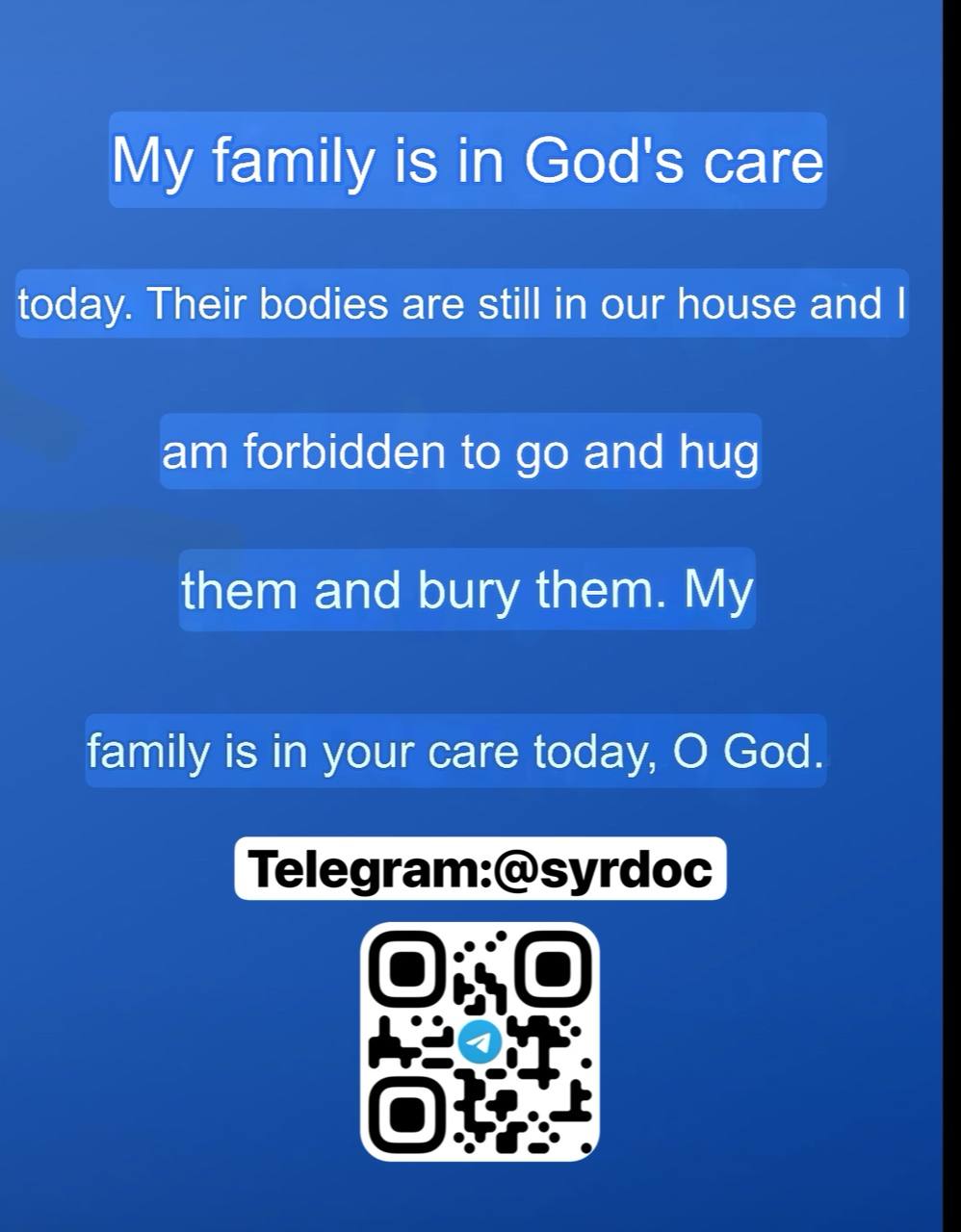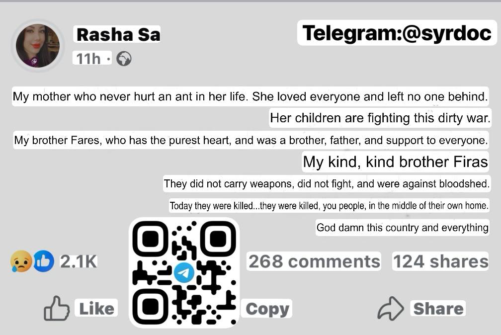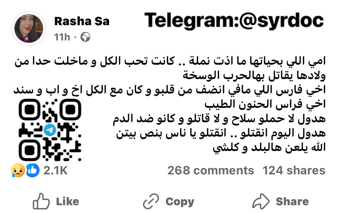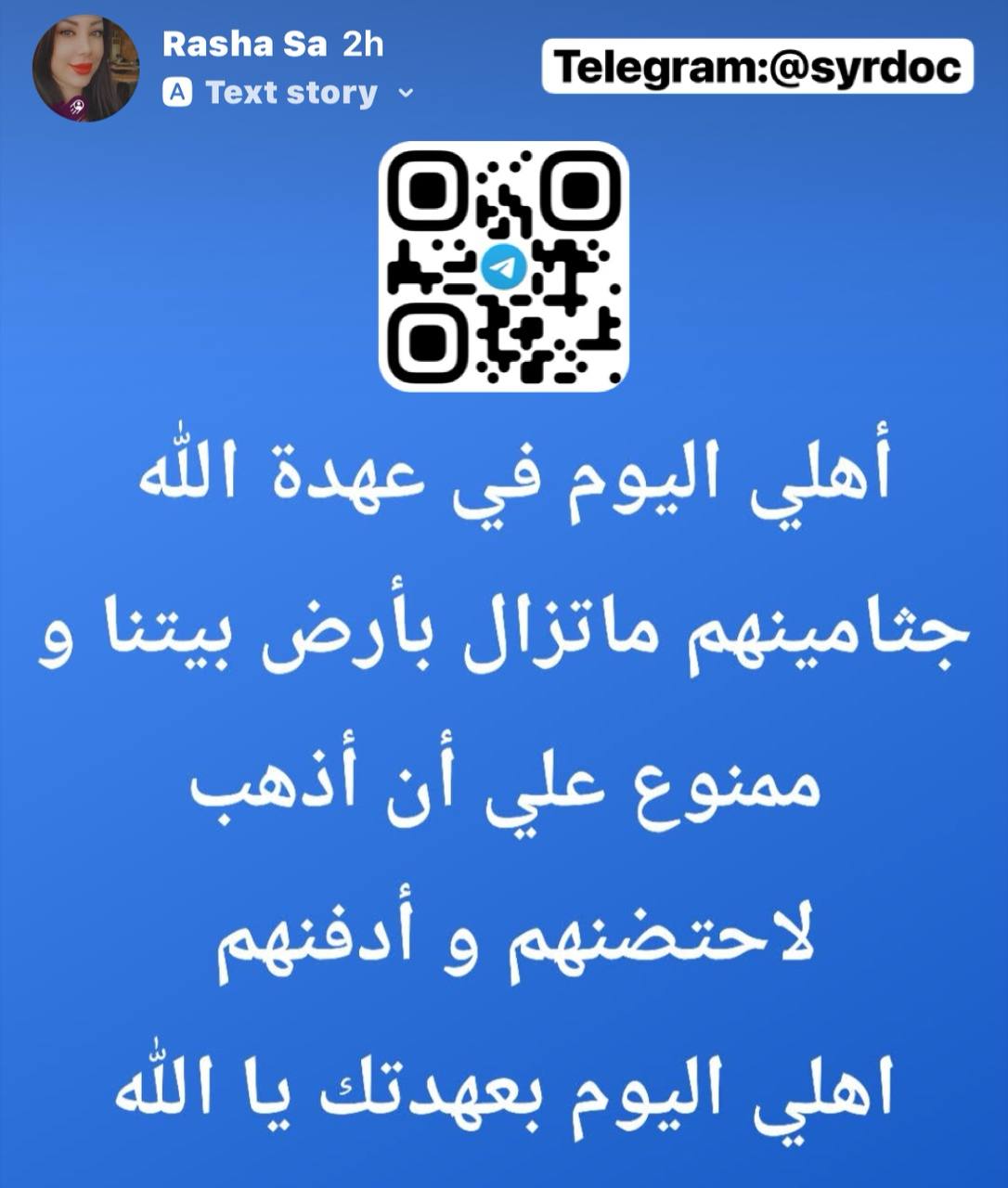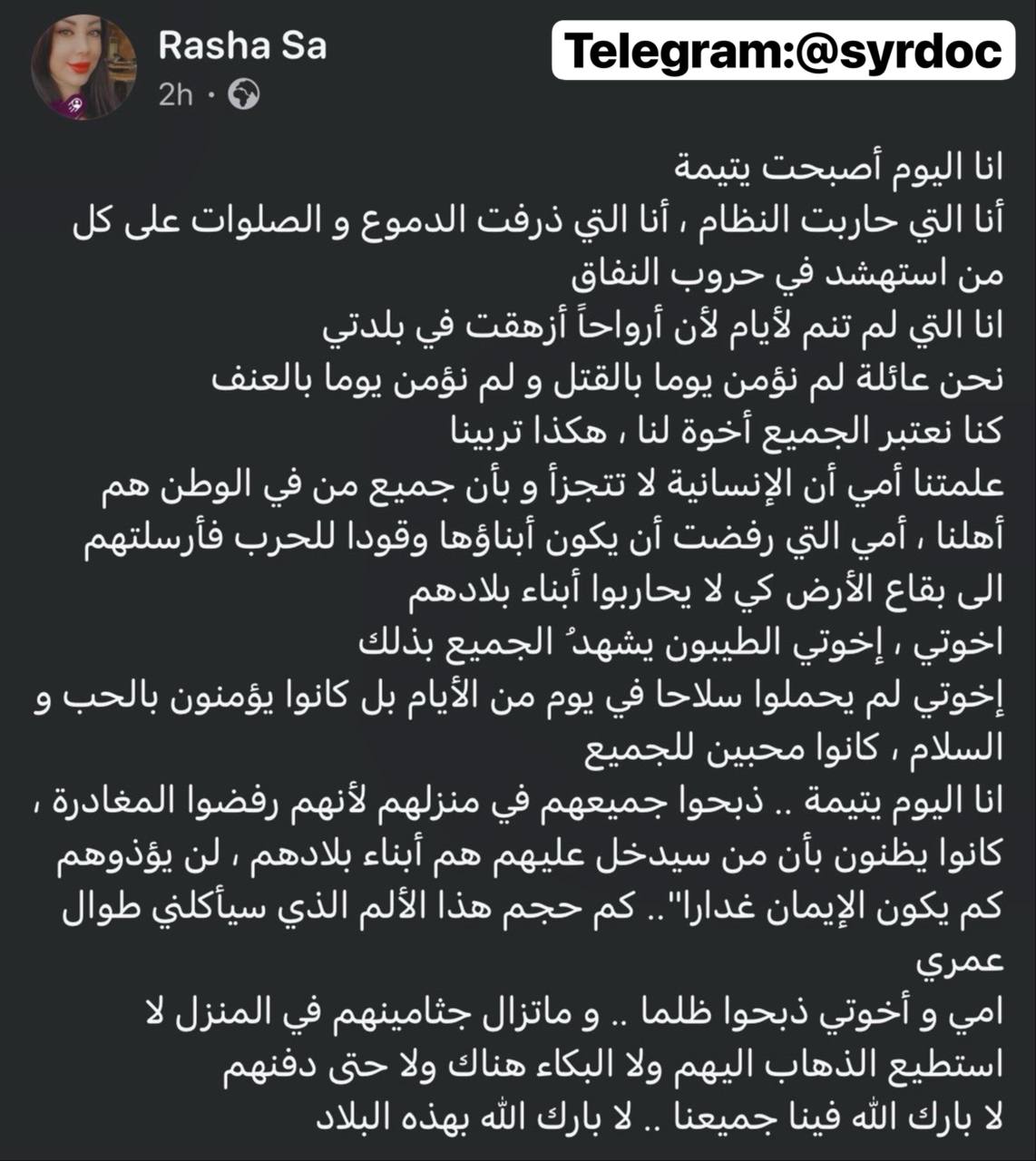 الناشطة السوريّة رشا المعروفة بنشاطها بالمركز السوري للعدالة و المساءلة تنعى والدتها و أخوتها الذين قتلوا على يد عناصر عصابات الجولاني الإرهابية أثناء اقتحام مدينة #بانياس اليوم.